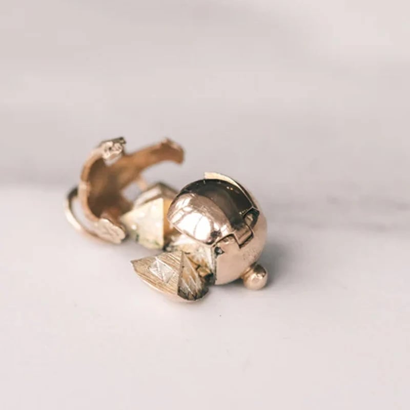 This pendant is a masterclass in vintage ingenuity! It begins as a sleek, hinged sphere – unlock the top hinge cage, and it unfolds into a cross shape with six pyramid tips pointing upward. Each pyramid face is etched with iconic Masonic symbols – think the Square & Compasses, All-Seeing Eye, Skull & Crossbones, Star of David, and more. It’s a hidden code, a fraternal identifier, and a work of art rolled into one tiny treasure.