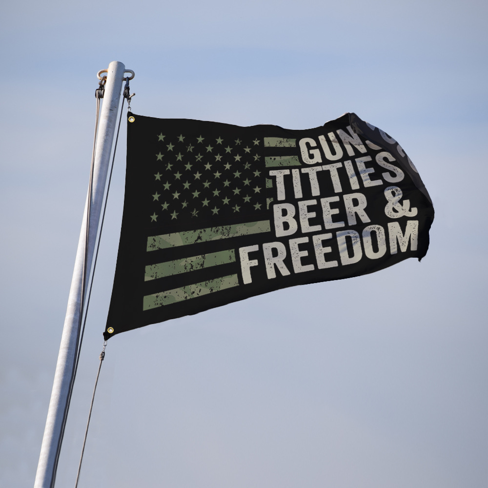 👉🤣Bold words: The eye-catching words "GUNS, TITTIES, BEER & FREEDOM" on the flag are displayed in large fonts, conveying an attitude of not being bound by rules and enjoying life.